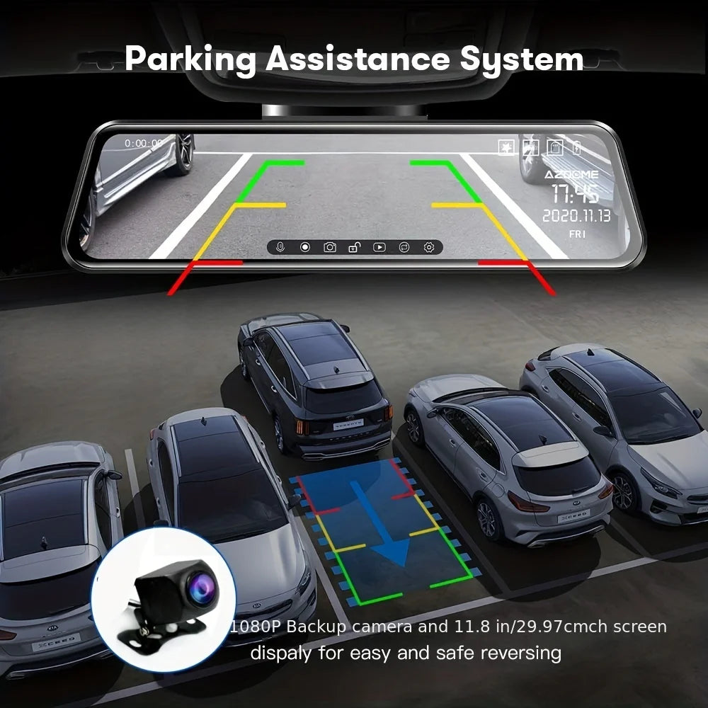 The AZDOME Mirror Dash Cam uses an 11.8" IPS anti-glare full touch screen with 2.5D glass. It supports front and rear camera recording, allowing you to switch between front and rear view or monitor dual lenses at the same time in order to view more traffic information and achieve safer driving/reversing. The simple interface with its fast response time gives you the best experience.