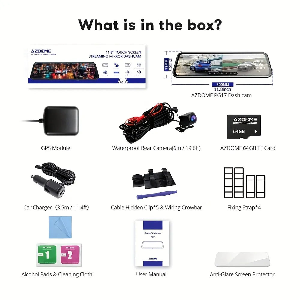 AZDOME PG17 Front and Rear Dual Dash Camera Mirror Dash Cam for Cars 11.8" Full Touch Screen 2K Night Vision Backup Camera