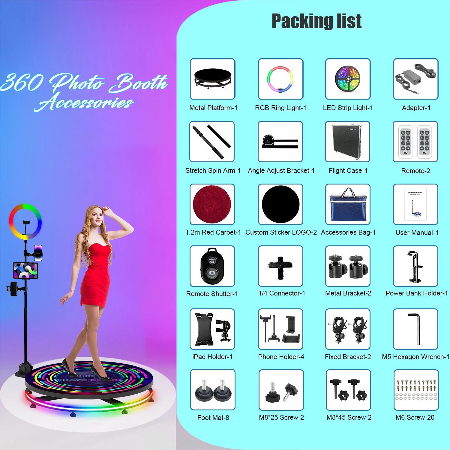 【360 Photo Booth Support Multiple Devices】Multiple holders support installation of mobile phones, i-Pads, cameras, etc.The selfie stick can be adjusted in length and angle.People freely revel in the center of the dance floor,the photo booth machine will record your wonderful moments.You can use for collection or share to social platforms.Suitable for large-scale events, weddings,shows, exhibitions, bar and celebration, film and television, advertising shooting etc.