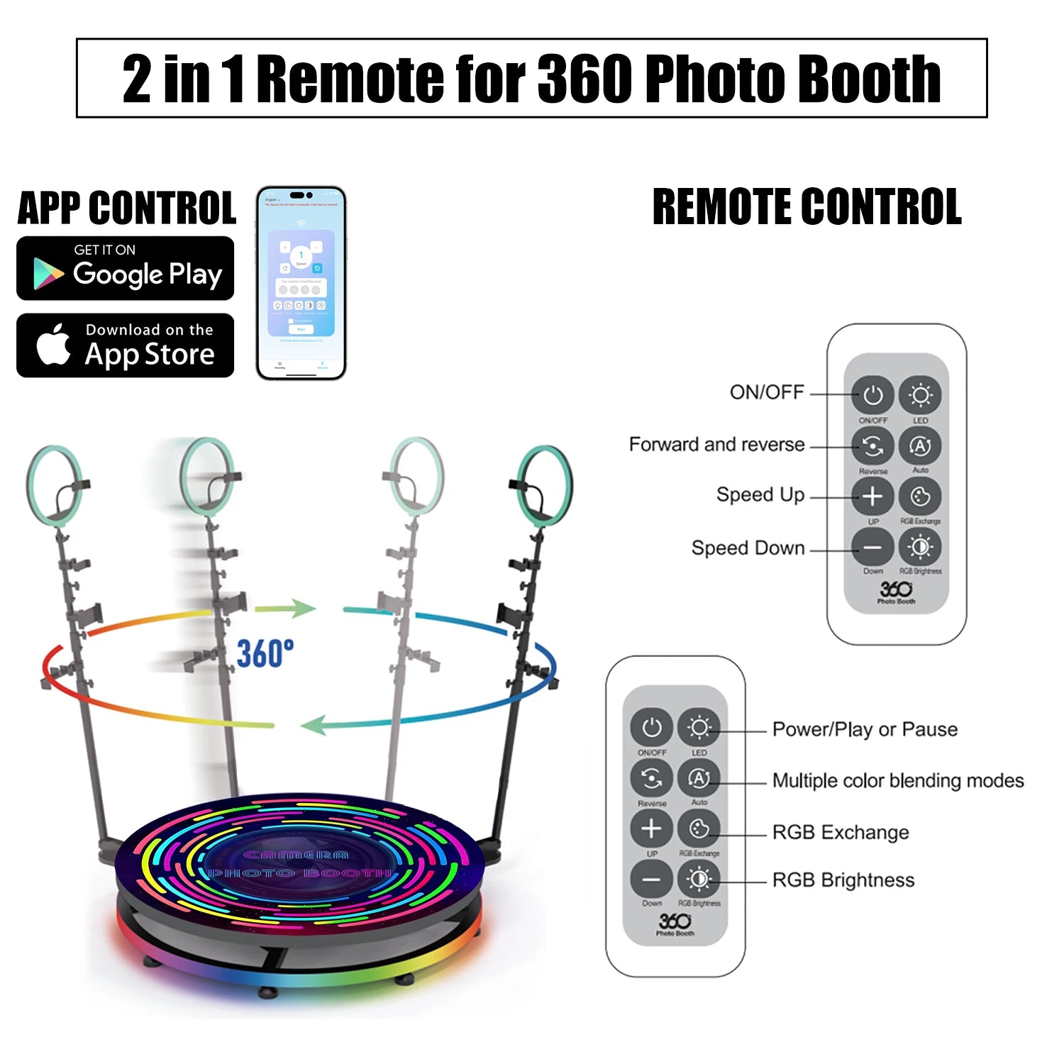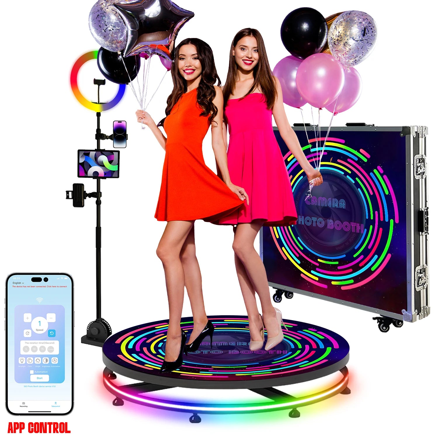 【APP/Remote Control】Two ways to control the 360 booth machine, button/APP(YTok) remote control 360 photo booth machine speed, clockwise or counterclockwise. 31.5 " bearing 440LB accommodating 1-3 people, 39.4 " bearing 880LB accommodating 3-5 people, 45.3 " bearing 1300LB accommodating 5-7 people.