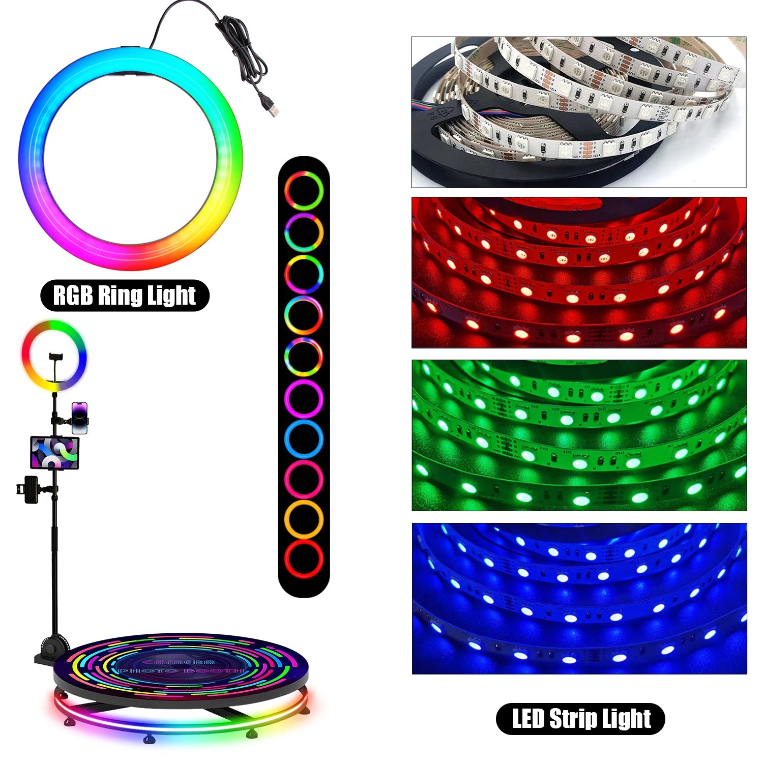 【360 Photo Booth with Ring Light and LED Strip Lights】USB ring light support installation of multiple mobile phones at the same time,has 3 colors lighting mode (cold white, warm yellow, warm white)and each lighting mode have 10 adjustable brightness to choose,also comes with multi-color LED strip lights.Magical lighting backgrounds will let you shoot amazing action videos.